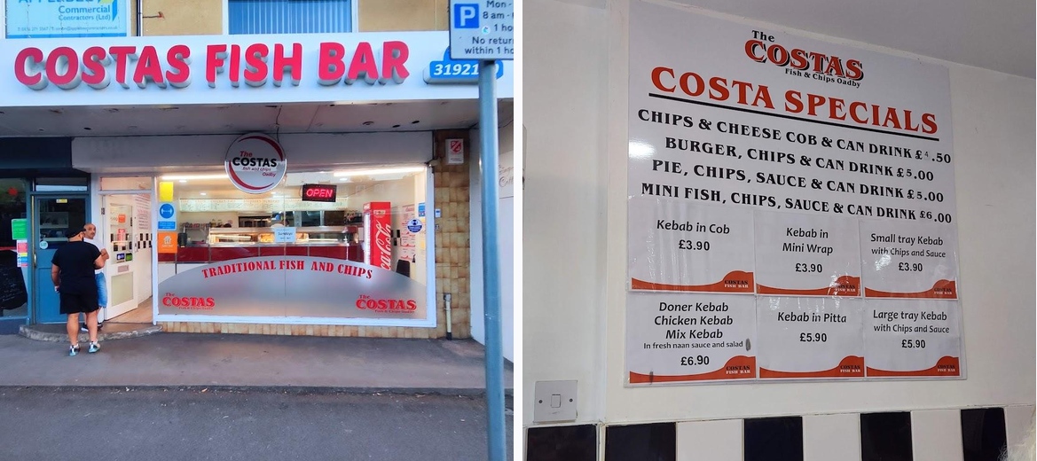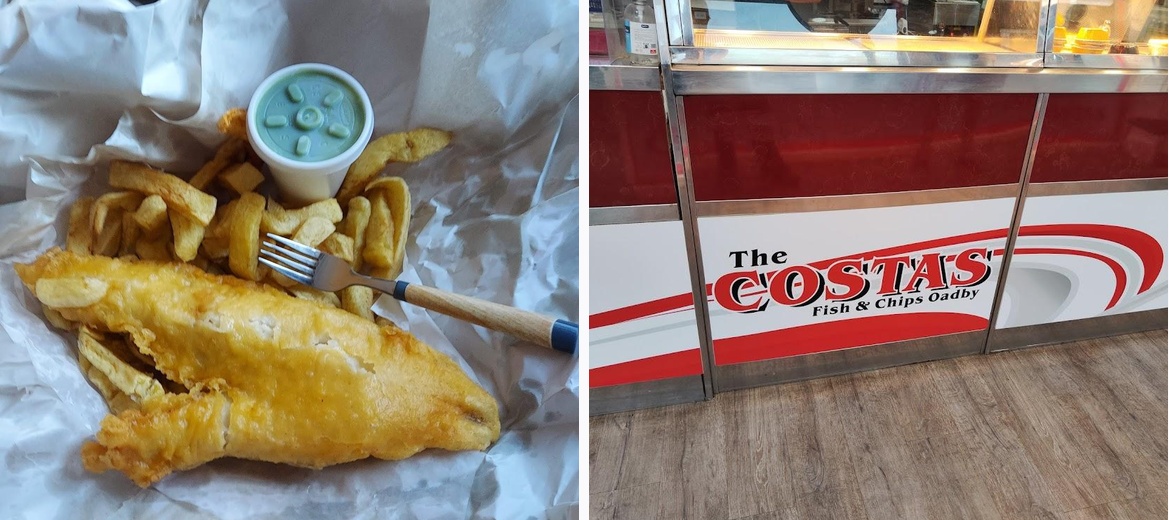 Welcome to Costas Fish Bar Limited, your go-to destination for mouth-watering fish and chips, along with delicious kebabs! Located at 52 London Rd, Oadby, Leicester, we specialize in quality takeaway options that cater to all cravings. Enjoy our casual dining atmosphere, perfect for lunch or dinner, where you can indulge in generous portions of freshly prepared dishes, including delightful masala chips and battered sausages. With convenient delivery, dine-in, and takeaway services, alongside a kids' menu and late-night food options, there's something for everyone. Visit us today or call +44 116 319 2100 to experience our friendly service and vibrant vibe!Customers often mention the generous portion sizes. For an impressively low price of £7.50, a meal consisting of masala chips and a veggie burger delights the taste buds without straining the wallet.