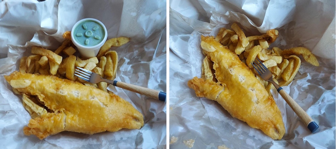 Freshly made to order Fish and Chip with mushy peas. Full side filet of Cod was lightly battered and plenty of chips. Huge portion! Service was expediant and polite. We watched our order made directly in front of us. Brilliant!