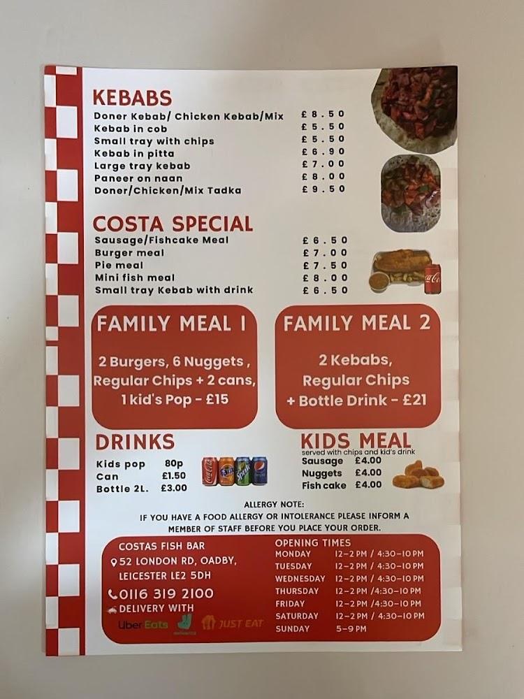Costas Fish Bar Limited is nestled at 52 London Rd, Oadby, Leicester LE2 5DH. This quaint eatery operates every day of the week, welcoming patrons with its casual vibe and a menu that captures timeless British fare alongside delicious kebab options.
